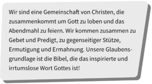 Wir sind Christen, die glauben, dass der Sohn Gottes, Jesus Christus, durch seinen Tod auf Golgatha unsere Sünden gesühnt hat. Deshalb wissen wir uns mit dem lebendigen Gott versöhnt.